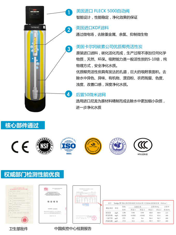 全屋中央凈水機(jī)有效去除水中的異色、異味;進(jìn)一步濾除水中微小雜質(zhì)、膠狀體;去除水中的漂白粉余氯、農(nóng)藥、重金屬;保留對(duì)人體有益的礦物質(zhì)。使水變得碧清、碧藍(lán),去除對(duì)人體有害的物質(zhì)。